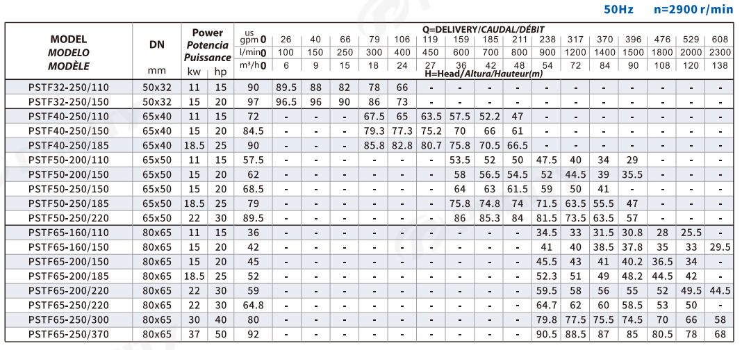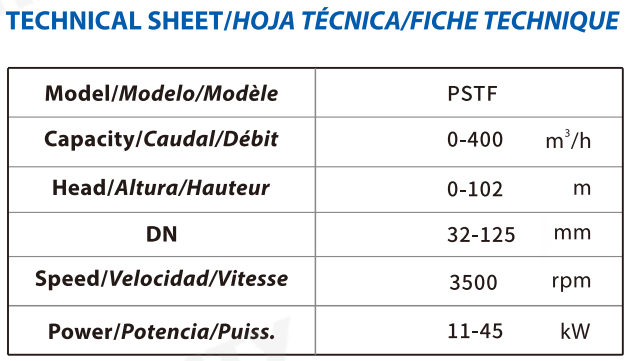 To meet various working conditions, the PSTF horizontal centrifugal pump is available with multiple impeller materials, including cast iron, bronze, and stainless steel. This flexibility enables the pump to handle different fluids and operating environments, ensuring stable performance across water supply, circulation systems, and general industrial applications.