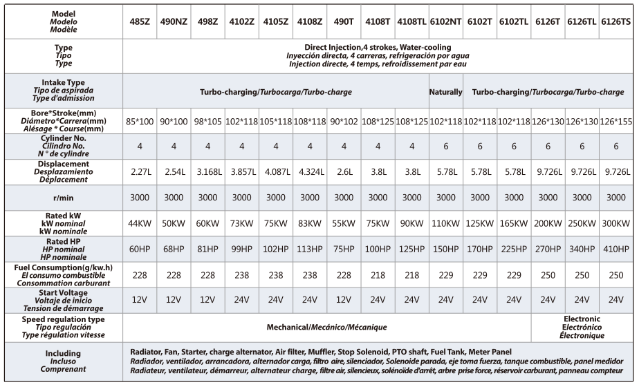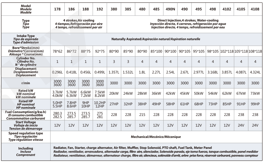 Los motores diésel Purity PD incluyen modelos monocilíndricos refrigerados por aire de aspiración natural, así como motores diésel refrigerados por agua de tres a seis cilindros. Las versiones refrigeradas por agua están disponibles tanto en configuraciones de aspiración natural como turboalimentadas, lo que permite a los usuarios seleccionar la solución más adecuada según los requisitos de potencia y las condiciones de trabajo. El motor diésel industrial monocilíndrico refrigerado por aire ofrece una estructura sencilla y un fácil mantenimiento, lo que lo hace ideal para unidades de bombeo compactas o móviles. En cambio, los motores multicilíndricos refrigerados por agua proporcionan un funcionamiento más suave, mayor potencia y mejor estabilidad térmica para aplicaciones de servicio continuo.