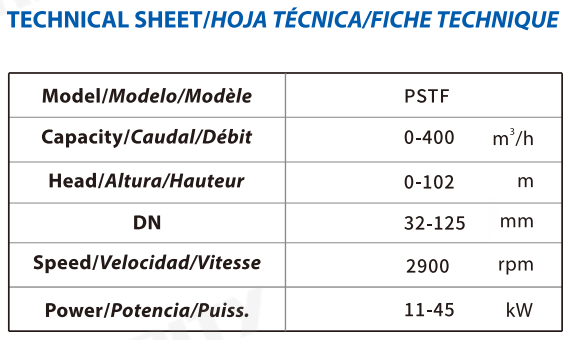To meet various working conditions, the PSTF horizontal centrifugal pump is available with multiple impeller materials, including cast iron, bronze, and stainless steel. This flexibility enables the pump to handle different fluids and operating environments, ensuring stable performance across water supply, circulation systems, and general industrial applications.